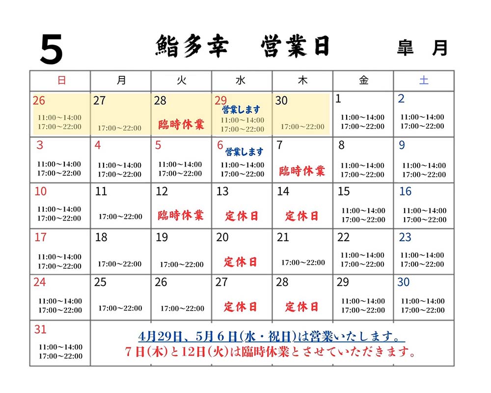 | 営業時間 | 11:00~14:00(金・土・日曜日と祝日のみ) 17:00~22:00 |