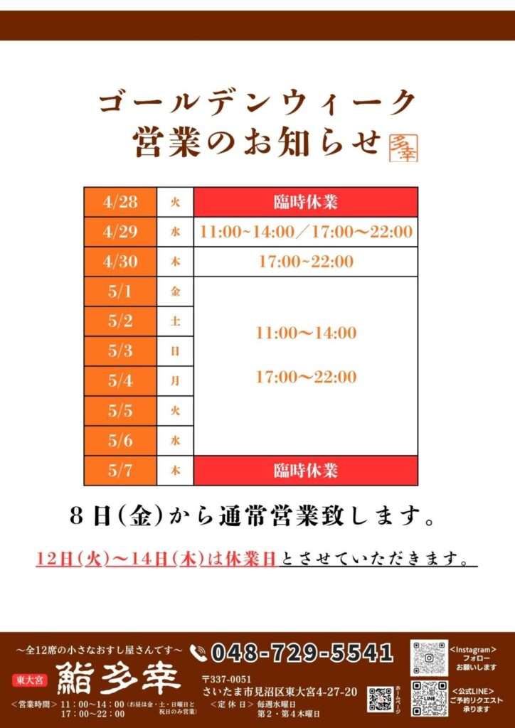 なお、4月28日(火)及び5月7日(木)は臨時休業とさせていただきます。