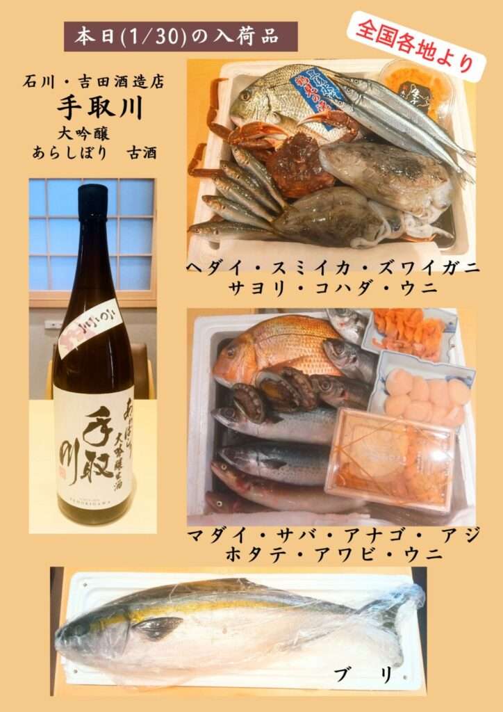 今週も全国各地より旬の魚介を入荷しています。握りのネタにお選びいただけるほか、お客様のご要望に応じて、一品料理等でお召し上がりいただくことも可能です。数に限りがありますので、お早めにご来店ください。