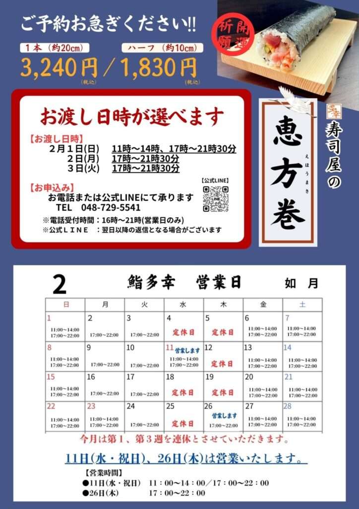 節分に向けた恵方巻のご用意はお済みですか?多幸では今年も、板長特製の9種の具材入り、開運祈願の恵方巻をご用意しております。お渡しは、お客様のご都合に合わせて2月1日~3日の中からお選びいただけます。ぜひご検討ください。