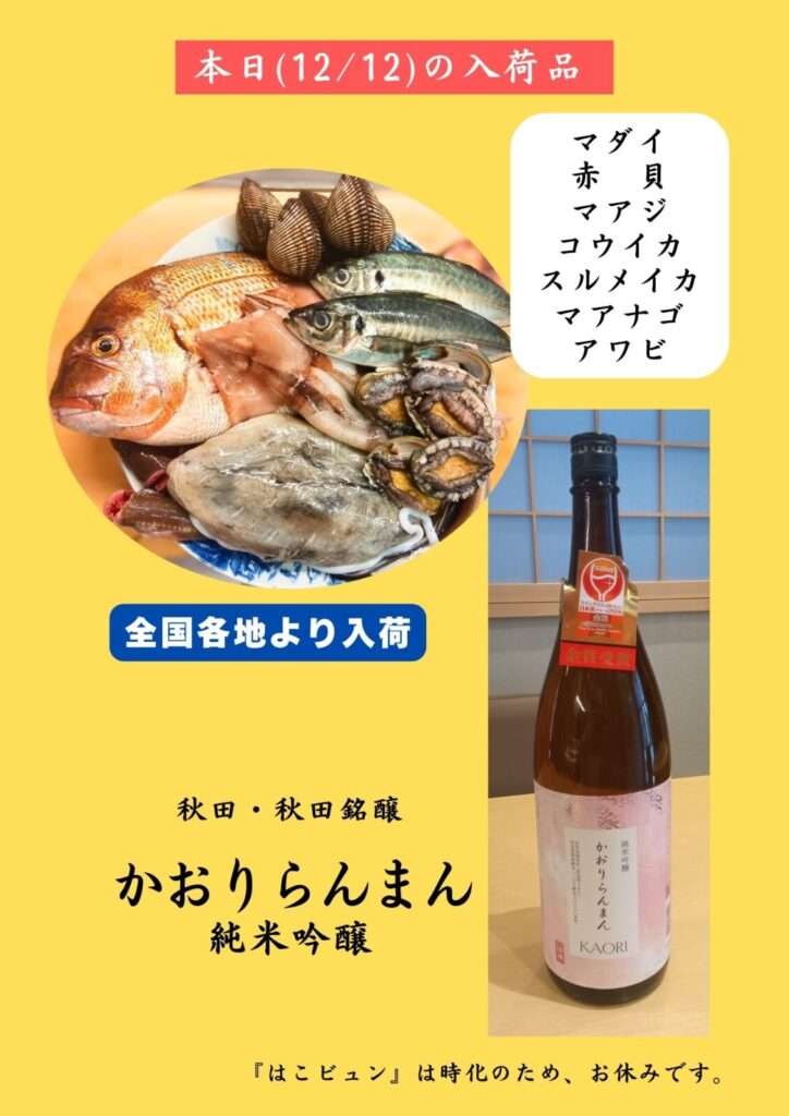本日の日本酒は秋田銘醸の『かおりらんまん』を入荷しております。お寿司や一品料理とともにぜひご賞味ください。