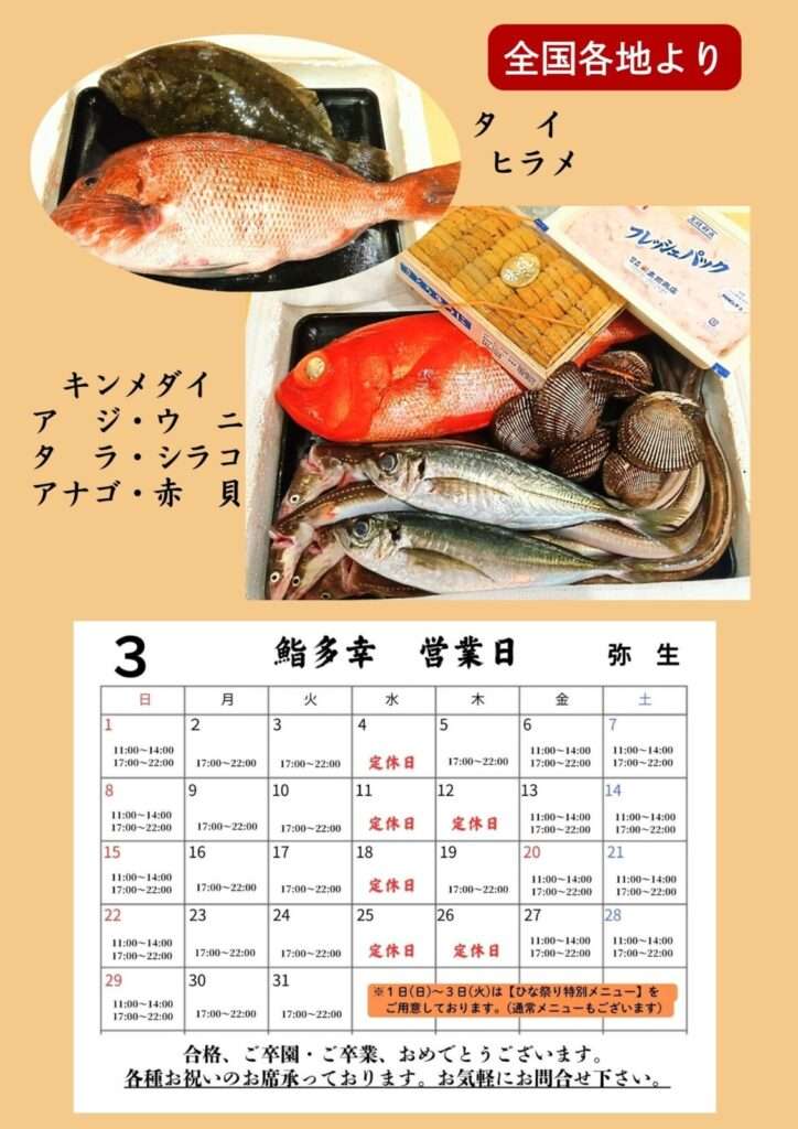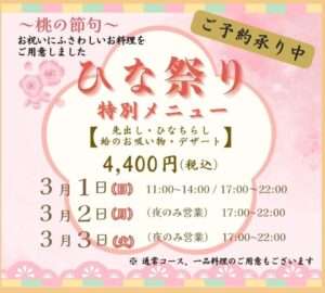 3月1日(日)~3日(火)は三日間限定で【ひな祭り特別メニュー】をご用意しております。 また、ひなちらし・おまかせ握り・お刺身等、各種テイクアウトのご予約も承っております。ご自宅でのお祝いやお食事にお気軽にご利用ください。