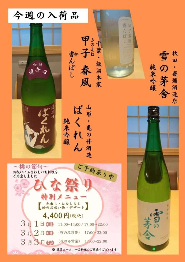 当店では、クラフトビールや焼酎、ワインなどお寿司に合うお酒を各種取り揃えております。特に日本酒は板長自ら、週替わりで全国の酒蔵から選りすぐりの品を入荷しています。 今週は、山形・秋田・千葉の銘酒が届きました。ぜひ一度ご賞味ください。