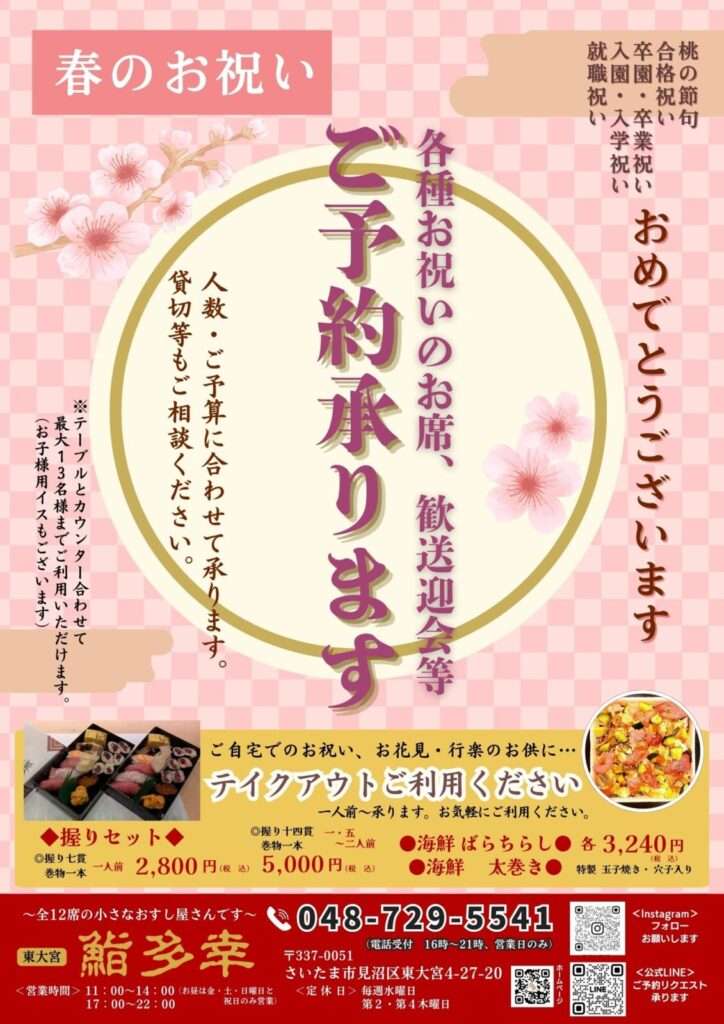 ただいま多幸では、各種お祝いや歓送迎会等、人数やご予算に応じたお食事会やご宴会等のご予約を承っております。 13名様までの貸切等も可能ですのでお気軽にご相談ください。