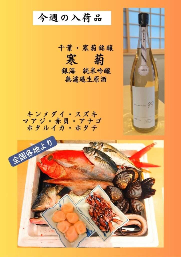 今週の日本酒は、千葉・寒菊銘醸から【寒菊 銀海】を入荷しました。全国各地からの新鮮な魚介類とともにぜひご賞味ください。いずれも数量限定での入荷となりますので、お早めにご来店ください。