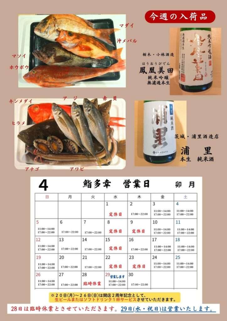 なお、4月28日(火)は臨時休業とさせていただきます。29日(水・祝日)は昼・夜ともに営業いたします。ご来店お待ちしております。