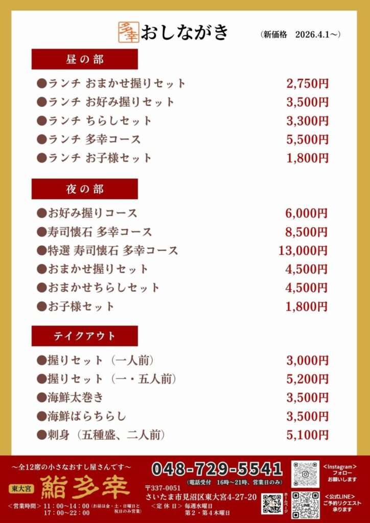 本日も全国各地からの鮮魚、栃木・茨城の銘酒を入荷しております。今後ともより良い商品とサービスを提供できるよう一層の努力をしてまいりますので、引き続き、鮨多幸をよろしくお願い申しげます。